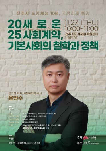 [전주시민신문] 현 정부의 국정 방향인 기본사회를 주제로 도시의 사회제도와 정책 방향이 나아갈 모색하는 특별한 강연이 전주에서 열린다.