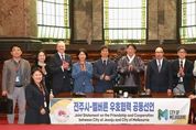 [전주시민신문] 전주시와 호주의 대표도시인 멜버른시가 상호 발전을 응원하는 동반자가 되기로 했다. 우범기 전주시장이 이끄는 전주시 대표단은 현지시간으로 지난 10일 호주 멜버른 시청을 방문해 케빈 로웨이 멜버른 시의원과 오진관 주 멜버른 대한민국 총영사, 마크 코크레인 멜버른 국제협력실 국장, 멜버른 지역 언론사 등이 참석한 가운데 양 도시간 교류를 더욱 발전시키기로 뜻을 모았다. 특히 양 도시는 이 자리에서 우호적 국제관계를 맺는 공동선언에 나섰다. 이날 서명한 협력 체결서에는 △문화예술교류 활성화 △문화산업 및 관광·도시디자인 협력 △지속가능한 문화경제 발전 △공공·민간협력 네트워크 구축 등의 내용이 담겨 있다. 전주시와의 국제교류를 약속한 멜버른시는 호주 빅토리아주 기초자치단체 중 핵심이 되는 도시로, 호주 내에서도 가장 살고 싶은 도시로 선정된 바 있다. 우 시장을 비롯한 전주시 대표단과 멜번시 관계자들은 우호 협력 체결 이후 문화예술과 관광, 스포츠, 경제, 도시디자인, 교육 등 다양한 분야의 교류 확대 방안을 논의하기도 했다. 전주시 대표단은 멜버른시청 방문에