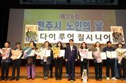 [전주시민신문] 100세 시대를 맞아 전주지역 노인들의 행복하고 건강한 노후생활을 함께 염원하는 노인의날 기념식이 열렸다. 전주시와 대한노인회 전주시지회(지회장 홍성언)는 14일 전주학생교육문화관 공연장에서 우범기 전주시장과 최주만 전주시의회 부의장, 김두봉 대한노인회 전북특별자치도연합회장, 표창 수상자 등 1200여 명이 참석한 가운데 ‘제29회 전주시 노인의날 기념식’을 가졌다. 송민주 대한노인회 전주시지회 사무국장의 사회로 진행된 이날 기념식은 △무지개예술자원봉사단(단장 고대현)과 아름다운 실버 전주의꽃(단장 김인식)의 식전 공연 △노인 강령 낭독 △청려장(장수지팡이) 수여 △전주시장 및 전주시의장 표창 수여식 △노인복지공로자에 대한 공로장 수여식 등의 순으로 진행됐다. 특히 우범기 전주시장은 이날 기념식에서 올해 100세를 맞이한 김옥순 어르신(여, 덕진동)에게 무병장수의 상징인 청려지팡이를 전달했으며, 홍성언 지회장은 축하의 꽃다발을 선물했다. 홍성언 대한노인회 전주시지회장은 “풍성했던 한가위도 지나가고, 땀과 노력으로 이뤄낸 결실의 계절 가을을 맞이해 참석해 주신 우범기 전주시장님, 최