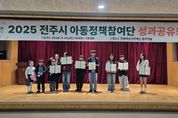 [전주시민신문] 유니세프 아동친화도시 전주시는 29일 전북여성가족재단 중회의실에서 아이들의 눈높이에서 아동정책을 제안해 온 아동정책참여단원들과 한자리에 모여 ‘2025년 전주시 아동정책참여단 성과공유회’를 개최했다. 올해 아동정책참여단은 아동이 주체적으로 아동 권리 보장을 위한 정책을 직접 발굴하기 위해 전주시에 거주하는 8~15세 아동 28명과 대학생 멘토 8명으로 구성됐다. 성과공유회는 아동정책참여단의 한 해 활동을 마무리하고 그간의 성과를 공유하는 자리로, 아동 단원들이 대학생 멘토와 함께한 활동 내용을 공유하고 소통하는 자리로 꾸며졌다. 이날 성과공유회는 △올해 아동정책참여단 활동영상 시청 △우수 활동 아동 표창장 수여 △조별 분임 토의를 통한 활동 내용 공유 순으로 진행됐다. 아동정책참여단은 지난 3월 발대식을 시작으로 대학생 멘토와 함께 아동의 눈높이에서 아동들을 위한 정책을 발굴하기 위해 온라인 의견 제안 활동에 꾸준히 참여했다. 그 결과 아동정책참여단은 △투명 페트병 무인 수거기 활성화를 위한 제안 △놀이터 환경개선을 위한 의견 제안 △아동돌봄시설 확대를 위한 제안 △등하