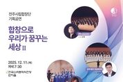 [전주시민신문] 전주시립합창단(예술감독 겸 지휘자 김철)이 지역사회와 함께 만들어가는 연말 음악 축제를 선보인다. 전주시립합창단은 오는 11일 오후 7시 30분, 한국소리문화의전당 연지홀에서 지역 아마추어 합창단과 함께하는 송년음악회를 개최한다. ‘합창으로 우리가 꿈꾸는 세상Ⅱ’ 제하의 이번 공연에는 전주시립합창단을 비롯해 △좋은친구들남성합창단(지휘 이영수) △전주엘여성합창단(지휘 윤영권) △전북레이디스합창단(지휘 박신) △완주에버그린콰이어(지휘 강연모) △부귀초등학교 꿈드림합창단(지휘 임연정) 등 5개 아마추어 합창단이 무대에 오른다. 특히 이번 공연은 총 200명의 연주자가 참여하는 대규모 연합무대로, 시민들에게 웅장한 합창의 감동을 선사할 것으로 기대를 모은다. 뿐만 아니라 이번 공연에서는 전주를 주제로 한 위촉 초연곡 ‘그곳에서’를 처음으로 선보인다. 홍원표 시인의 시에 전주 출신 작곡가 이범준이 곡을 붙인 이 작품은 전주에 대한 그리움과 사랑, 그리고 다시 만남을 바라는 마음을 담아낸 노래로 구성됐으며, 공연 후반부 연합합창으로 울려 퍼지며 송년 무대의 절정을 장식할 예정이다.