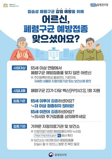 만 65세 이상 중 폐렴구균 23가 다당 백신(PPSV23)을 한 번도 접종하지 않은 어르신은 건강 상태가 좋을 때 보건소 또는 지정의료기관에서 무료로 1회 접종할 수 있다.
