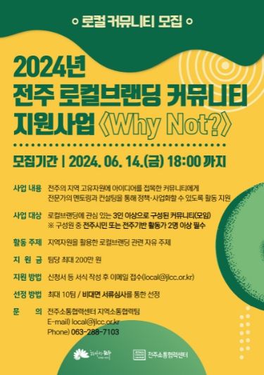 한편 로컬브랜딩 커뮤니티 지원 사업은 전주시 민간위탁기관인 전주시 지역소통협력센터에서 맡아 추진하며, 지역소통협력센터는 로컬브랜딩 활성화사업 외에도 사회적경제 지원사업과 마을공동체 지원사업 등 지역사회 변화와 발전을 위한 다양한 사업들을 추진하고 있다.