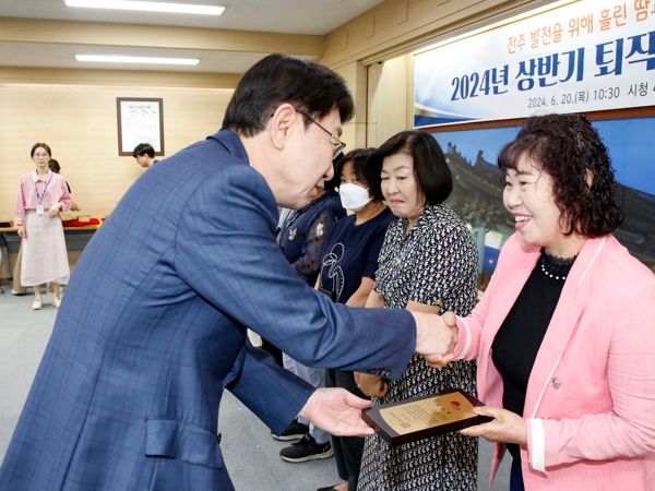 [전주시민신문] 전주시는 20일 시청 4층 회의실에서 ‘2024년 상반기 임기만료 퇴직통장 공로패 수여식’을 열고 지난 1월부터 6월까지 통장 임기가 만료돼 퇴직한 127명(완산구 71명, 덕진구 56명)에게 공로패를 수여했다.