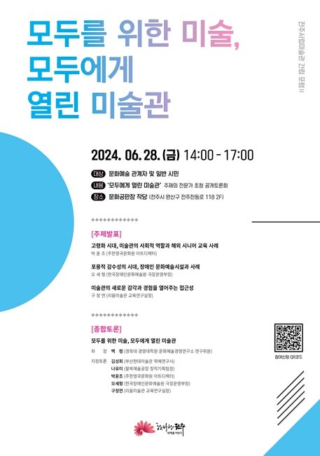 이어 백령 경희대 경영대학원 문화예술경영연구소 연구위원을 좌장으로 주제발표자 3인과 김성희 부산현대미술관 학예연구사, 나유미 팔복예술공장 창작기획팀장 등이 패널로 참여해 ‘모두에게 열린 미술관’을 주제로 지정토론도 이어갈 예정이다.