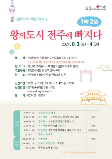 김성환 전주시 한옥마을사업소장은 “가족들과 좋은 추억을 만들 수 있는 이번 연수 프로그램을 통해 한국의 전통문화에 흠뻑 빠져 시원한 여름을 보내시길 바란다”고 전했다.