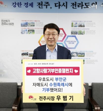 우 시장은 이날 자신의 고향인 부안군과 전주시의 자매도시인 수원특례시에 각각 고향사랑기부금을 기탁하고, 권익현 부안군수와 이재준 수원특례시장을 각각 후속 주자로 지목했다.