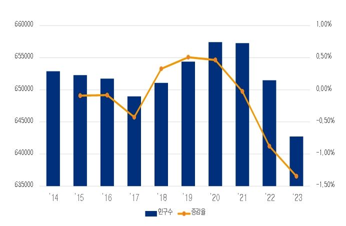 전주시의 인구는 2021년 기준 65만 명 선을 유지했으나, 이후 급격한 감소 추세를 보여 2023년 기준 64만2727명으로 감소했다. 인구증가율 또한 지속적으로 감소해 2023년 기준 –1.35%까지 감소했다. 또 2020년을 기점으로 사망자 수가 출생자 수를 초과했으며, 전입·전출자도 지속적으로 감소해 2022년 기점으로 순유출로 전환됐다.