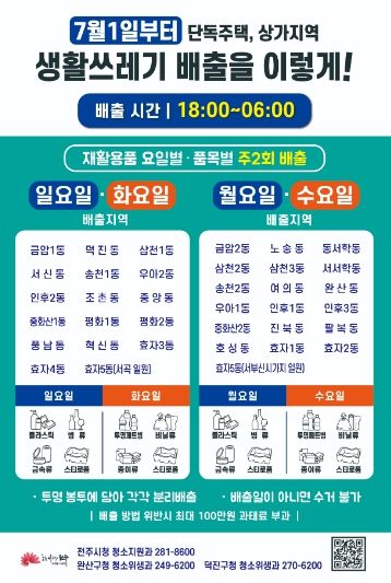 이에 시는 새로운 쓰레기 배출제도 시행 후 발생하는 시민들의 불편을 최소화하기 위해 35개 동 주민센터와 완산·덕진구청과 협력해 신속하고 정확한 정보를 제공하고 있다.