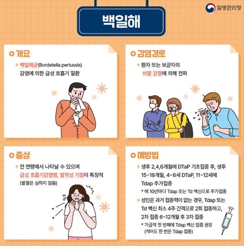 백일해란 백일해균 감염으로 발생하는 호흡기 질환으로 잠복기는 최소 4일에서 최장 21일이며 감기와 증상이 비슷하지만 100일 동안 기침한다는 뜻을 지닐 정도로 증상이 지속되는 것이 특징이다.