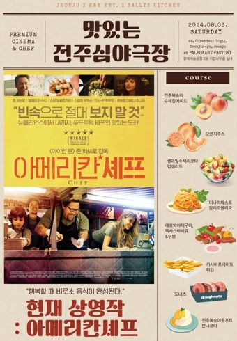 먼저 오는 3일에는 해고당한 일류 셰프가 푸드트럭에 도전한 후 진정으로 자신의 음식과 인생을 요리하는 미국 영화 ‘아메리칸 셰프’가 상영되며, 전주의 식재료로 조리된 영화 속 음식을 맛볼 수 있다.