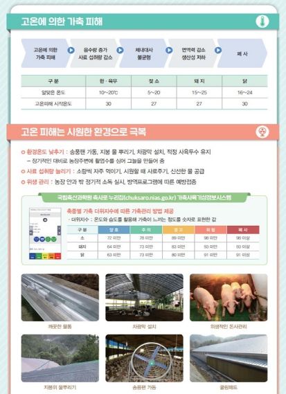 축산 및 농업 분야에서는 피해를 최소화하기 위해 농가를 대상으로 재해보험 가입을 독려하고, 폭염 대비 가축 관리 요령을 적극적으로 전파하고 있으며, 시군과 협력하여 폭염 취약 농가에 대한 현장 점검을 집중적으로 실시하고 있다.