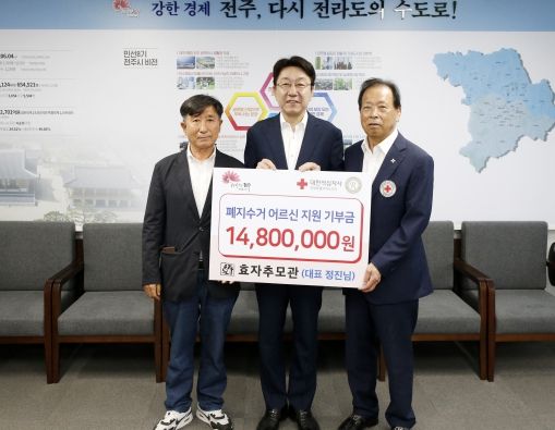 [전주시민신문] 전주시는 12일 전주시청에서 정진 효자추모관 회장 등이 저소득 폐지 수거 어르신 74명에 1480만원 상당의 온누리상품권을 기부했다고 밝혔다.
