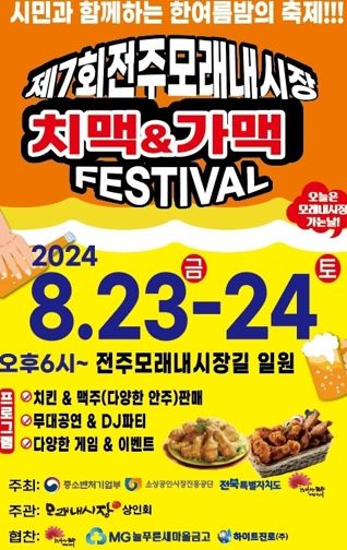 당장 오는 23일부터 24일까지 오후 5시 30분부터 시작되는 제7회 치맥&가맥 페스티벌에서는 막바지 여름철 무더위를 시원한 맥주로 날리면서, 시장에서 직접 튀겨 만든 치킨을 비롯해 전통시장을 대표하는 음식을 맛볼 수 있도록 준비된다.