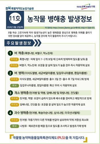 이정임 전북자치도농업기술원 기술보급과장은 “이상고온이 지속됨에 따라 벼를 비롯한 주요 작물에서 해충이 급증할 가능성이 크다”며, “지속적인 모니터링과 적기방제를 통해 피해를 최소화할 수 있도록 기술지원을 강화하겠다.”고 밝혔다.
