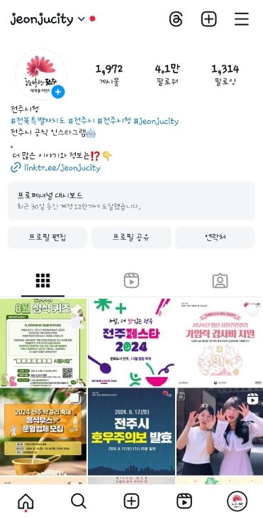 특히 전주시 인스타그램의 경우 지난 2022년 7월 팔로워 수 2만6800명에서 현재 4만1900명으로 약 157%나 증가하며 가파른 성장세를 보이고 있다.