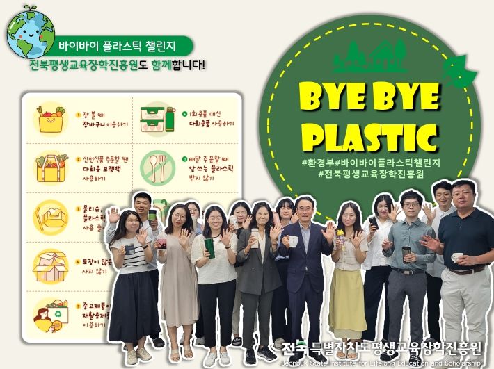 [전주시민신문] (재)전북특별자치도평생교육장학진흥원(이현웅 원장)이 26일 전 직원들과 함께 불필요한 플라스틱 사용 자제를 위한‘바이바이 플라스틱(Bye Bye Plastic, BBP) 챌린지’에 참여했다.