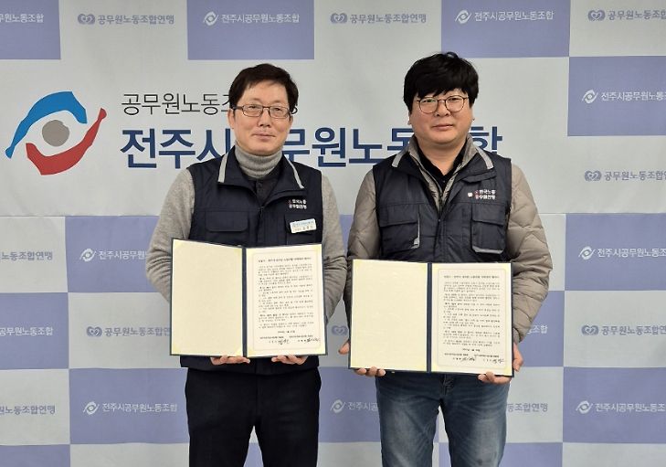 전주시공무원노동조합(위원장 김경오)은 지난달 30일 전주시청 내 노동조합 사무실에서 안동시공무원노동조합(위원장 유철환)과 자매결연 협약식을 가졌다고 밝혔다.