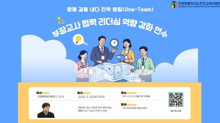 [전주시민신문] 전북특별자치도전주교육지원청은 오는 20일 전주시그니처호텔에서 관내 고교 부장 교사를 대상으로 ‘진학 원팀(One-Team) 부장교사 협력 리더십 역량 강화 연수’를 운영한다고 10일 밝혔다.