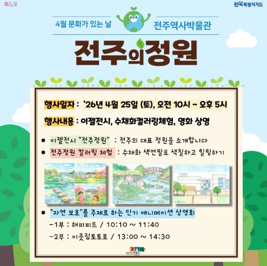 전주역사박물관 관계자는 “이번 ‘전주정원’ 문화의 날 행사가 봄의 따뜻한 기운 속에서 전주의 아름다운 자연과 정원문화를 느끼며 온 가족이 힐링하는 소중한 시간이 되길 바란다”면서 “앞으로도 매달 계절과 시기에 맞는 다채로운 문화 체험 프로그램을 마련해 시민 여러분께 풍성한 문화 향유의 기회를 드리겠다”고 말했다.